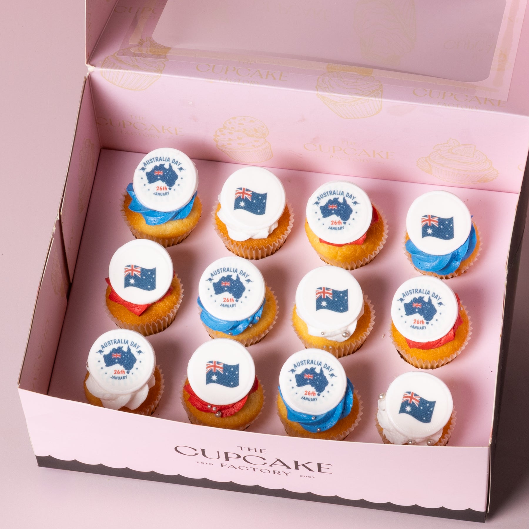 Celebrate Australia Day with these vibrant cupcakes, each topped with bold blue buttercream icing and sparkling silver ball sprinkles. Finished off with a printed plaque featuring the Australian Flag. Perfect for your Australia Day BBQ or gathering, these cupcakes are the sweetest way to show your Aussie pride!