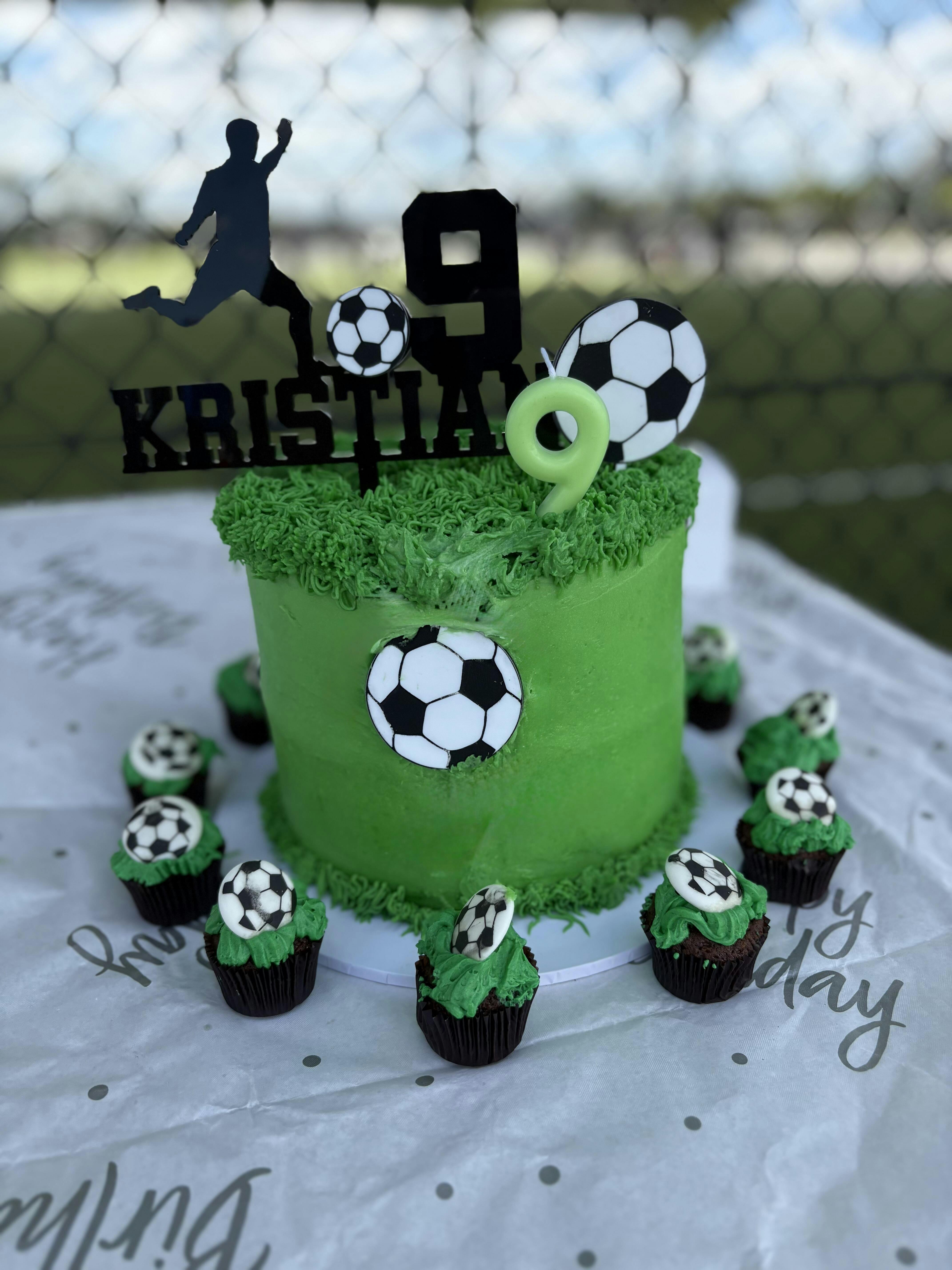 Score big with these sporty treats! Topped with luscious buttercream piped like fresh green grass and finished with cute soccer ball decorations, perfect for fans, players, and party champions alike.