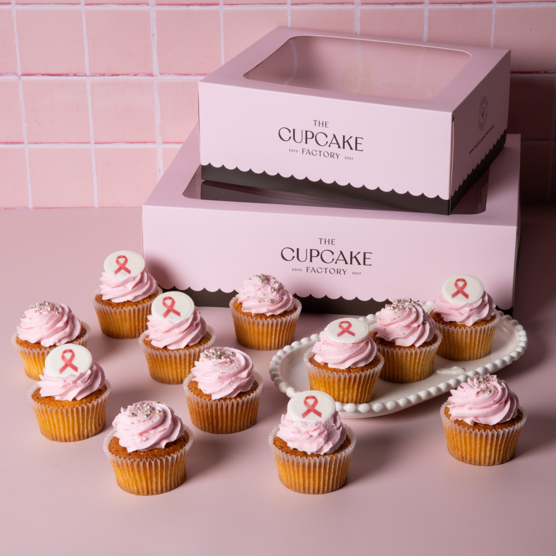 Delicately crafted and thoughtfully styled, these cupcakes feature soft pastel buttercream swirls topped with pretty pink bow plaques. A sweet way to show support, raise awareness, and celebrate strength with every bite.
