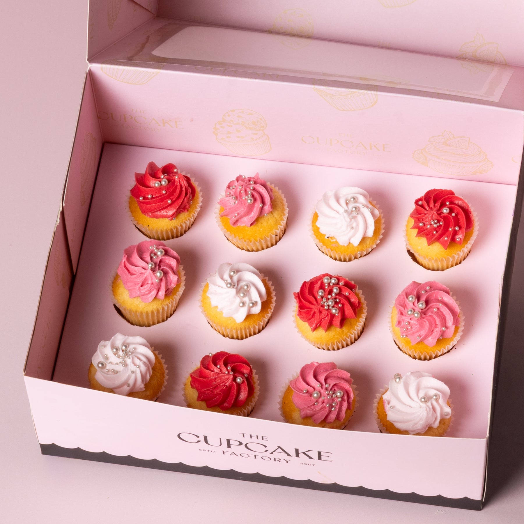 A box of 12 pink cupcakes can serve a small group on its own, or multiple boxes can be ordered to cover larger guest lists.