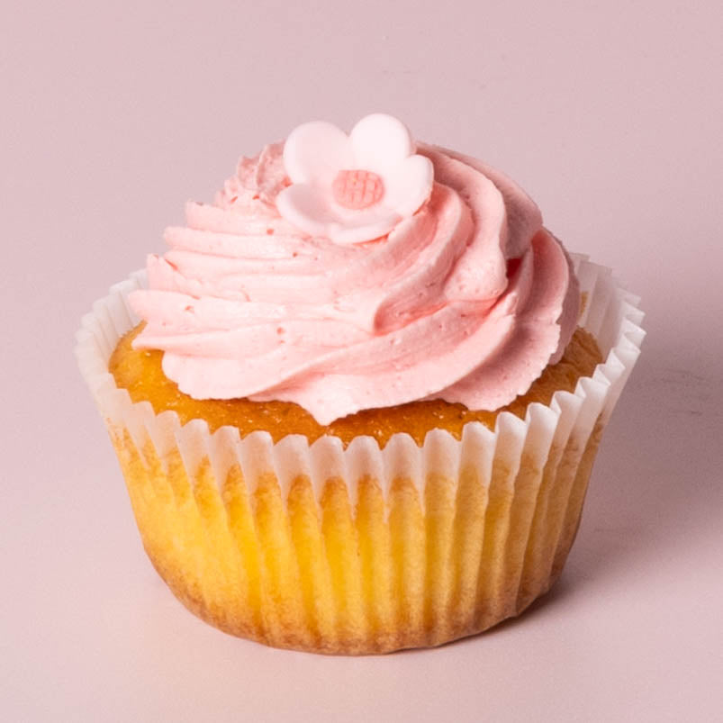A fluffy vanilla (or chocolate!) base, topped with luscious pink icing and finished with an edible blossom flower. It’s the perfect blend of sweet and stylish, delicate, delicious, and ready to add a little floral flair to any occasion.