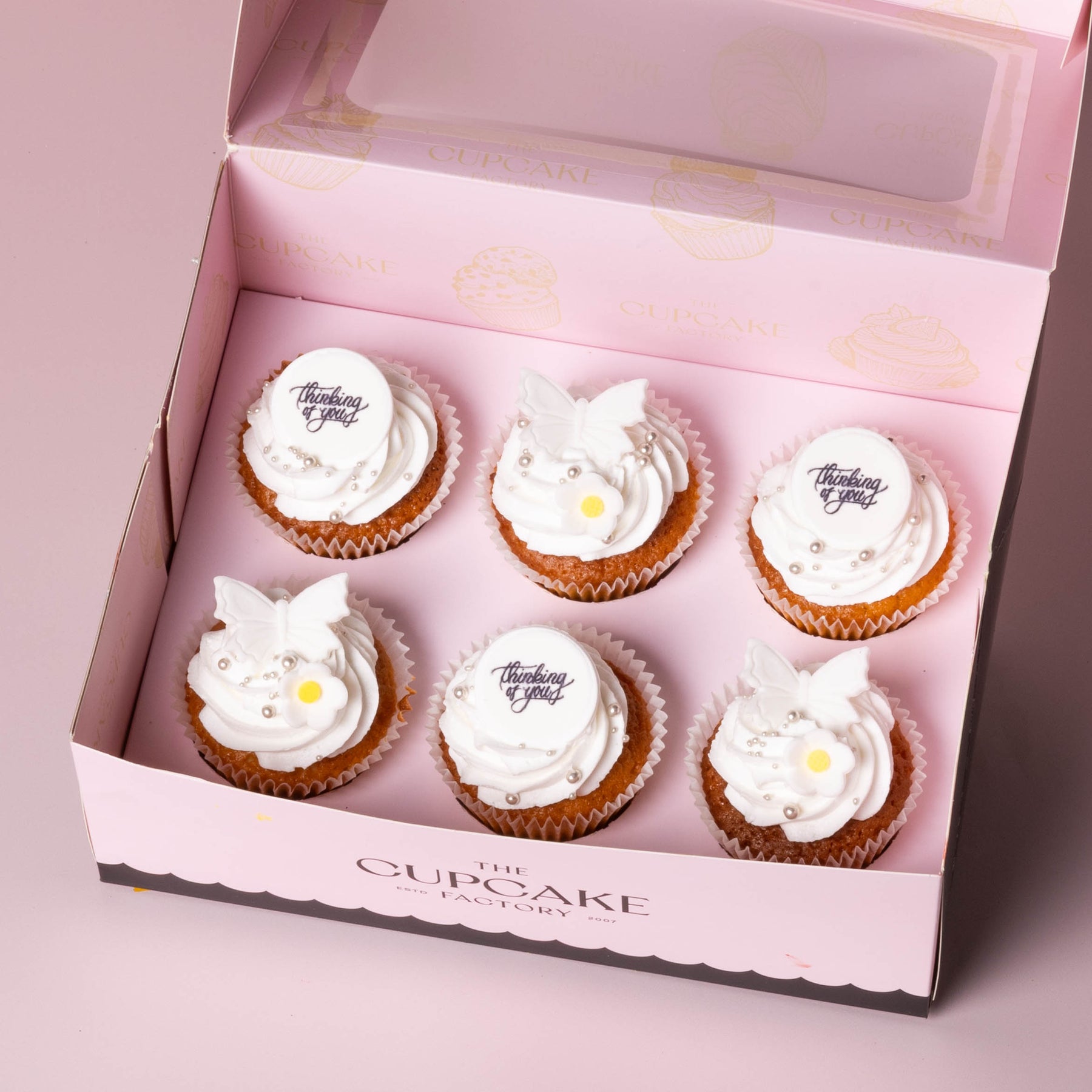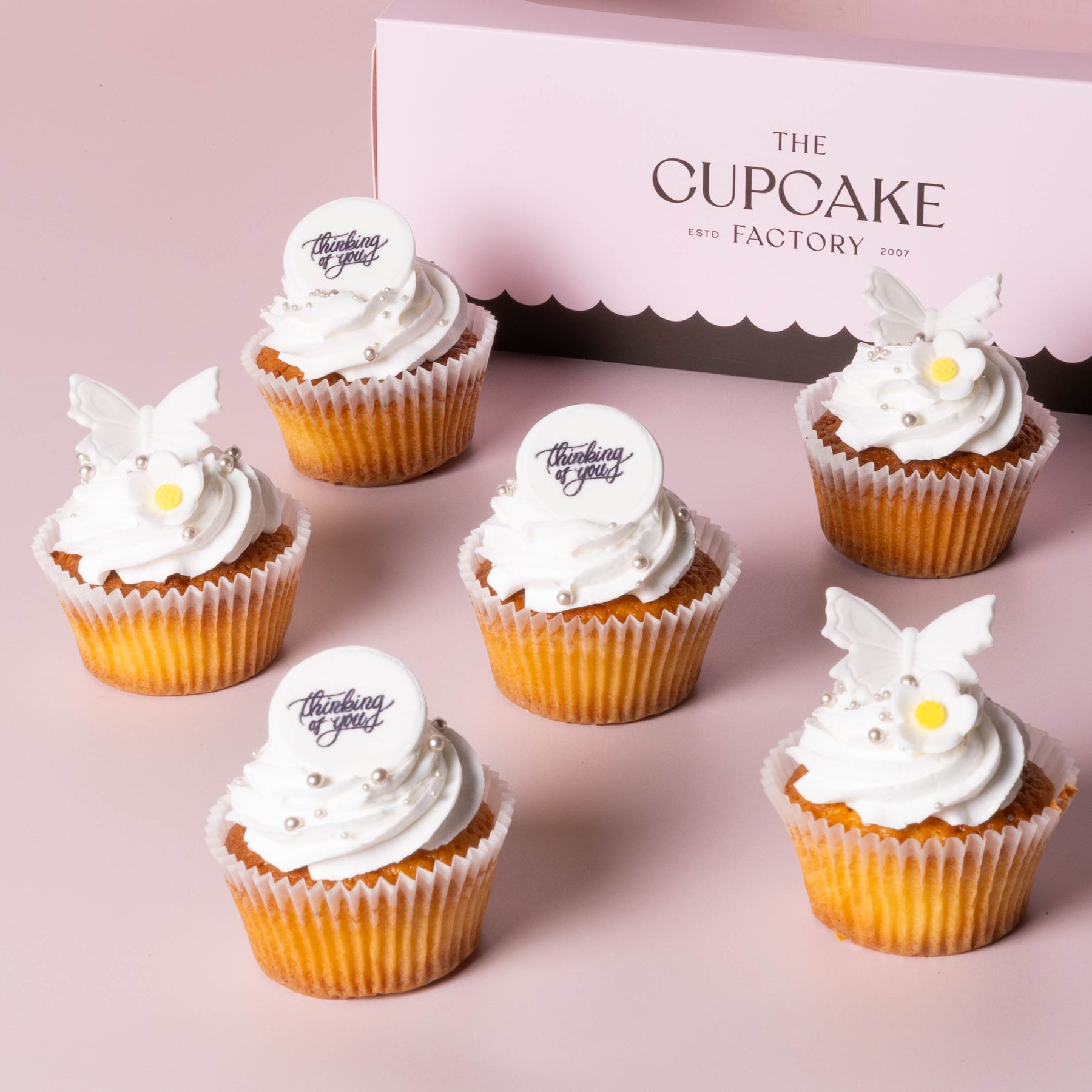 Send a little love! These beautifully decorated cupcakes feature luscious buttercream, topped with delicate white sugar flowers and heartfelt “Thinking of You” plaques, the perfect sweet gesture to brighten someone’s day.