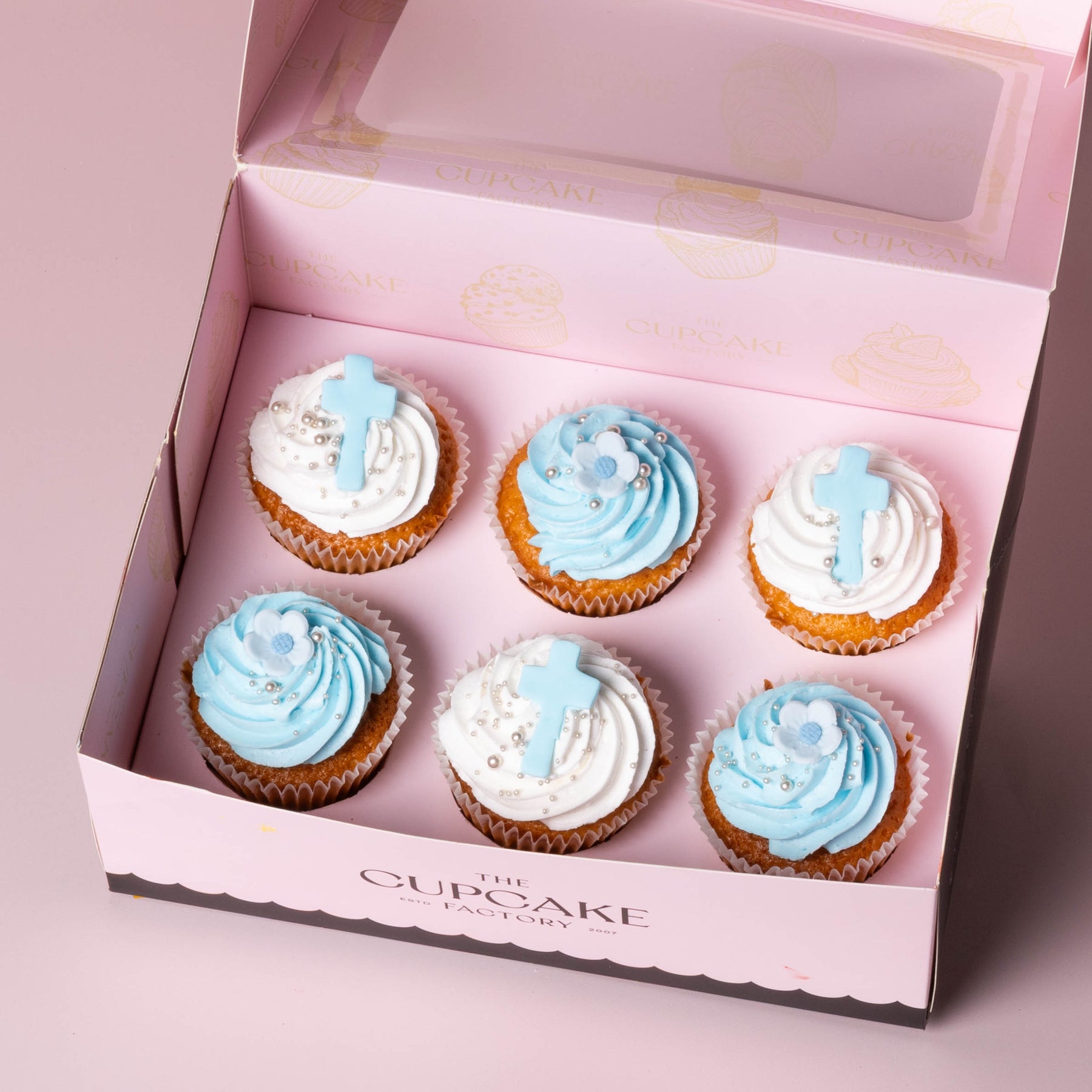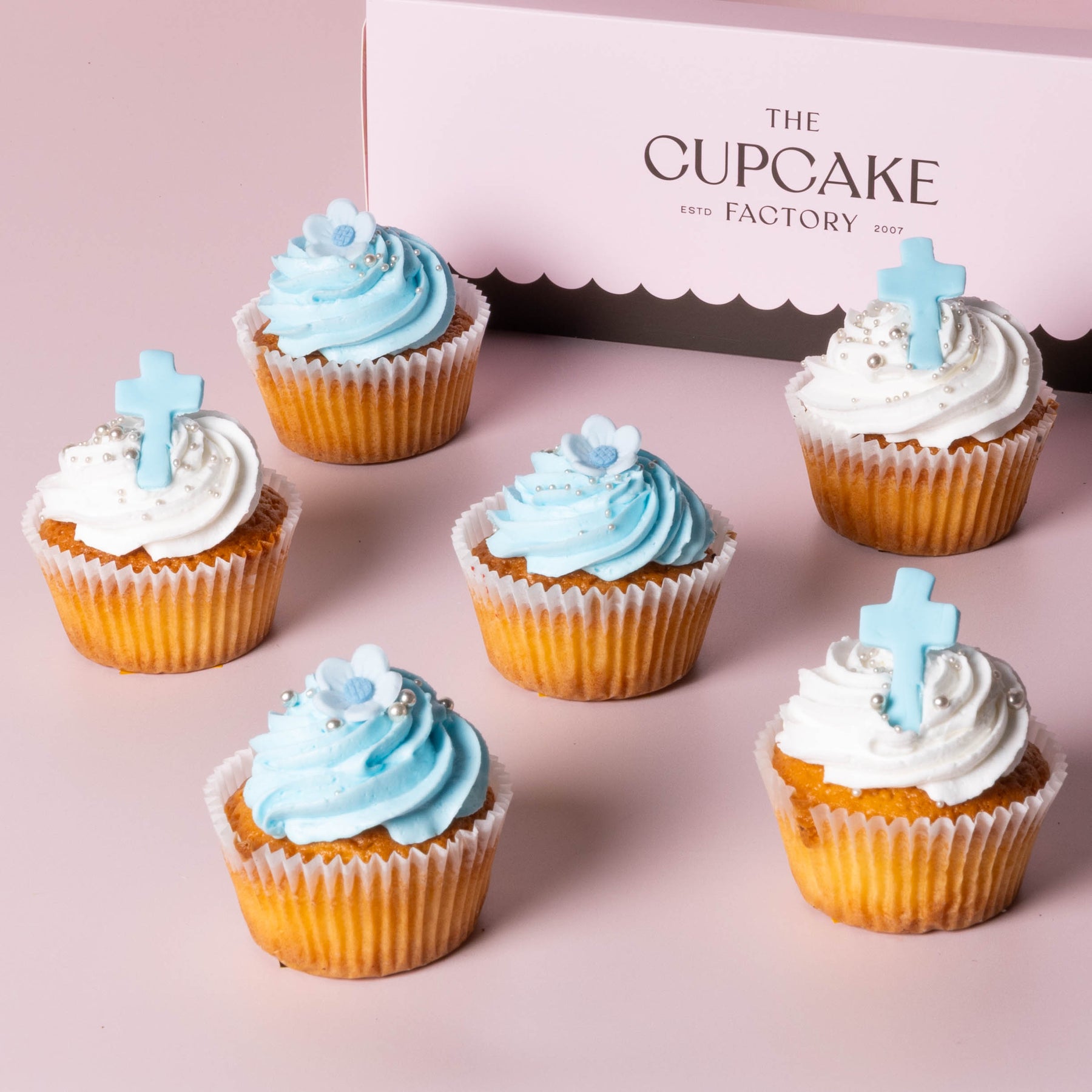 While achievable, keeping piping consistent and decorations even across a dozen can be tricky. Blue Christening Cupcakes from The Cupcake Factory arrive uniform, boxed and photo-ready.