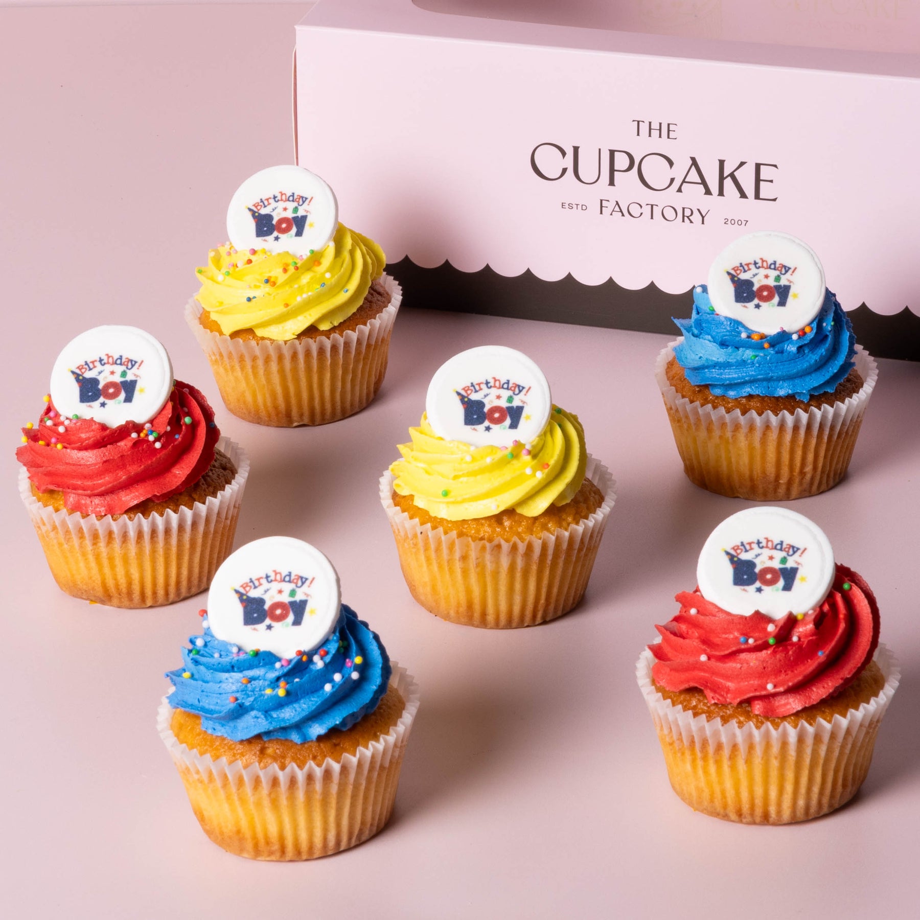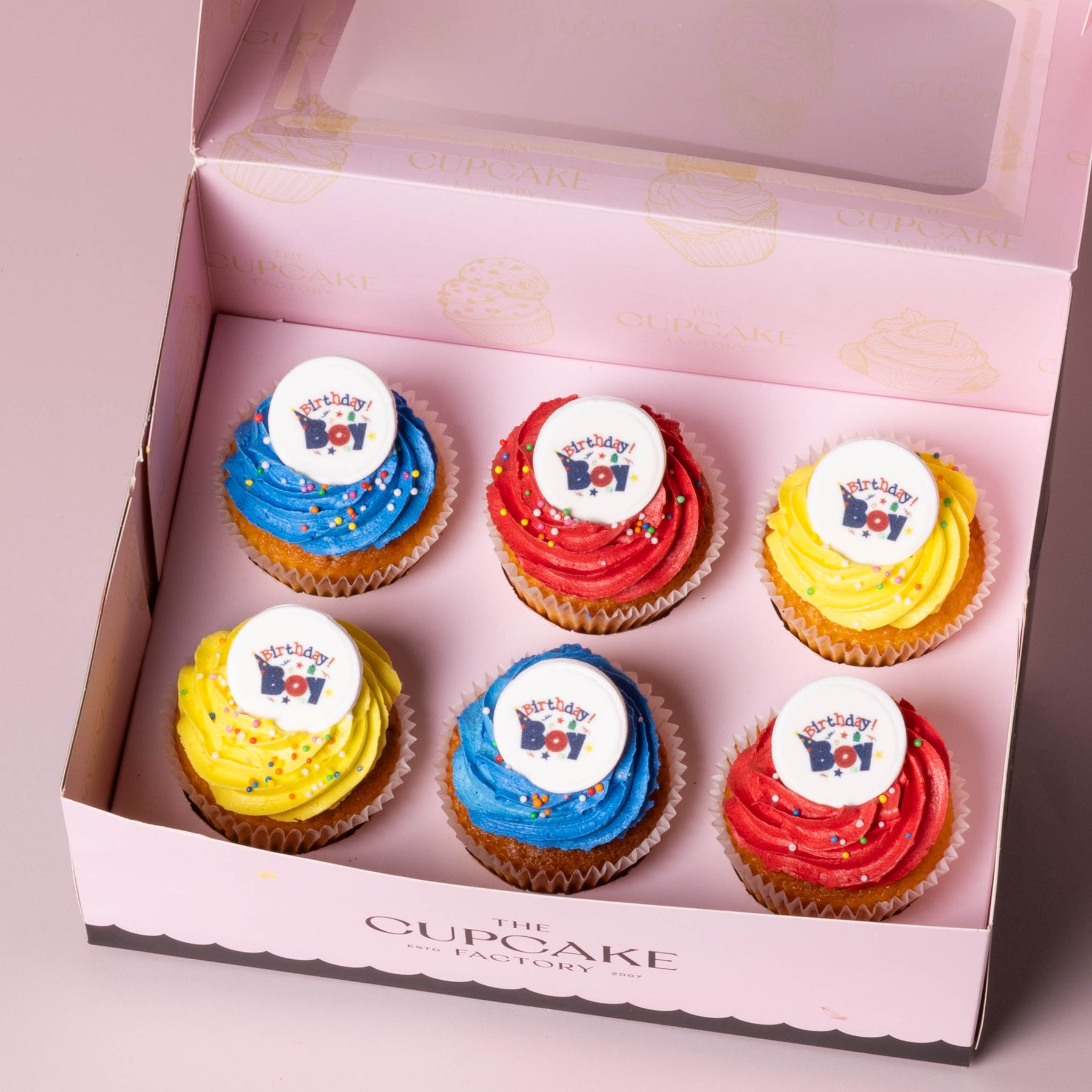 Bright, bold, and made to party. This lively mix features the cupcakes topped with silky buttercream swirls with half decorated with birthday edible treats and the other half dressed up with custom birthday boy plaques. Perfect for making the birthday boy’s day unforgettable, stylish, fun, and packed with flavour.