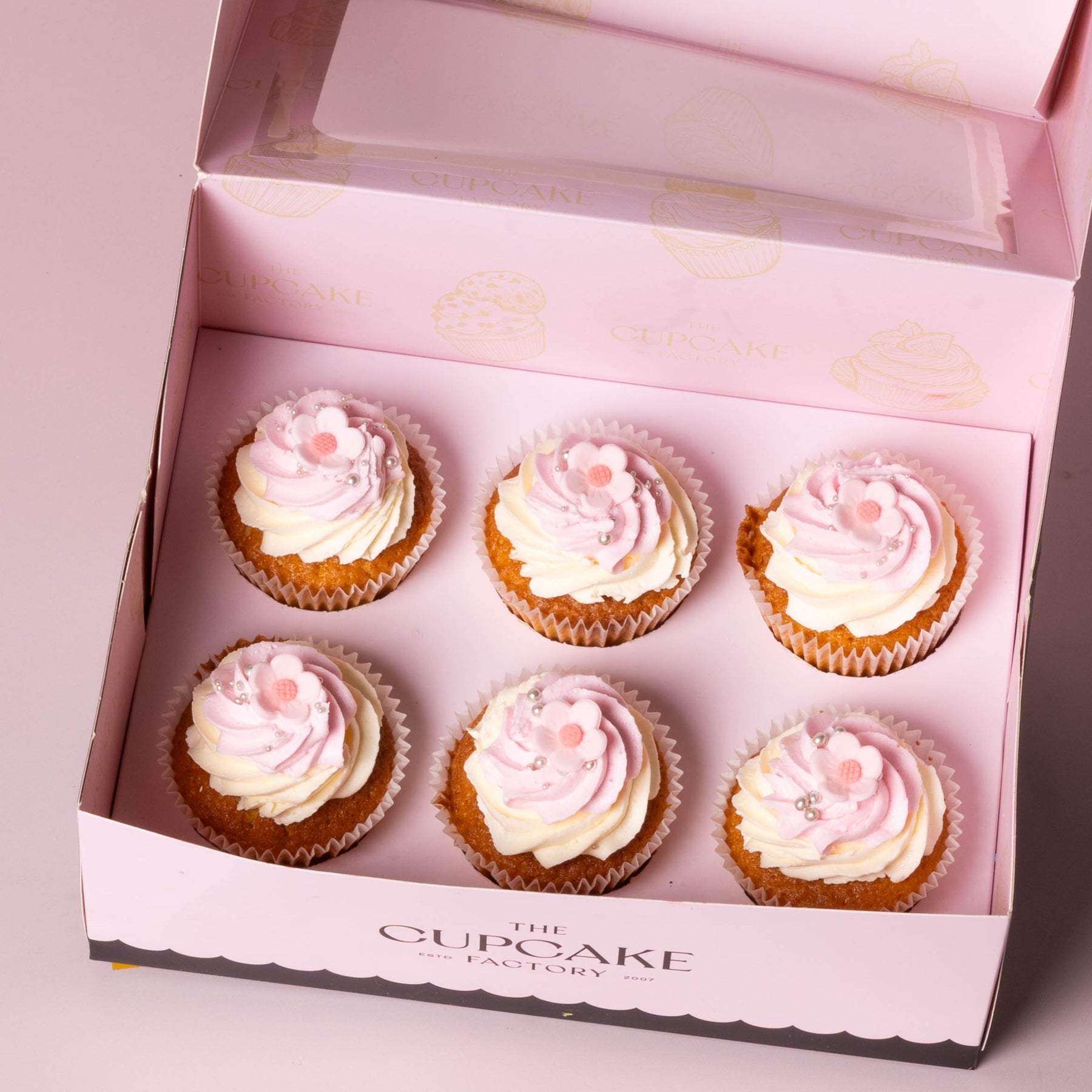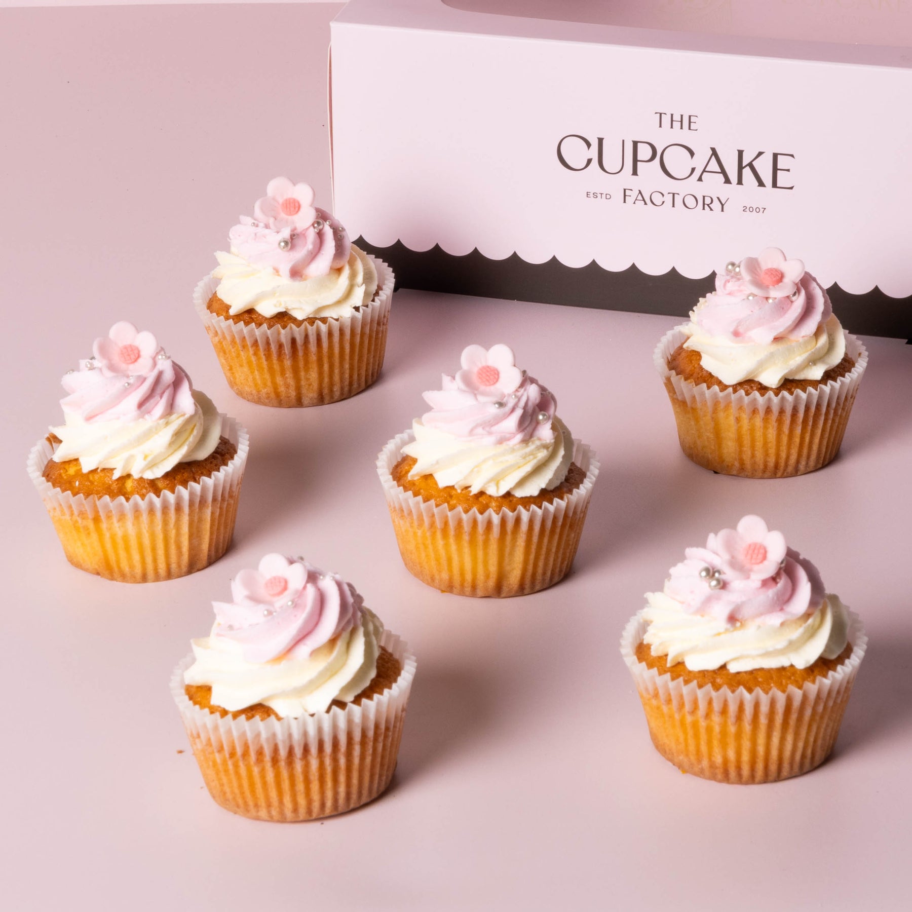 Delicate vanilla sponge topped with two-toned buttercream that’s as pretty as a picture, finished off with a gorgeous edible blossom. It's elegance in a bite, perfect for every celebration, big or small.