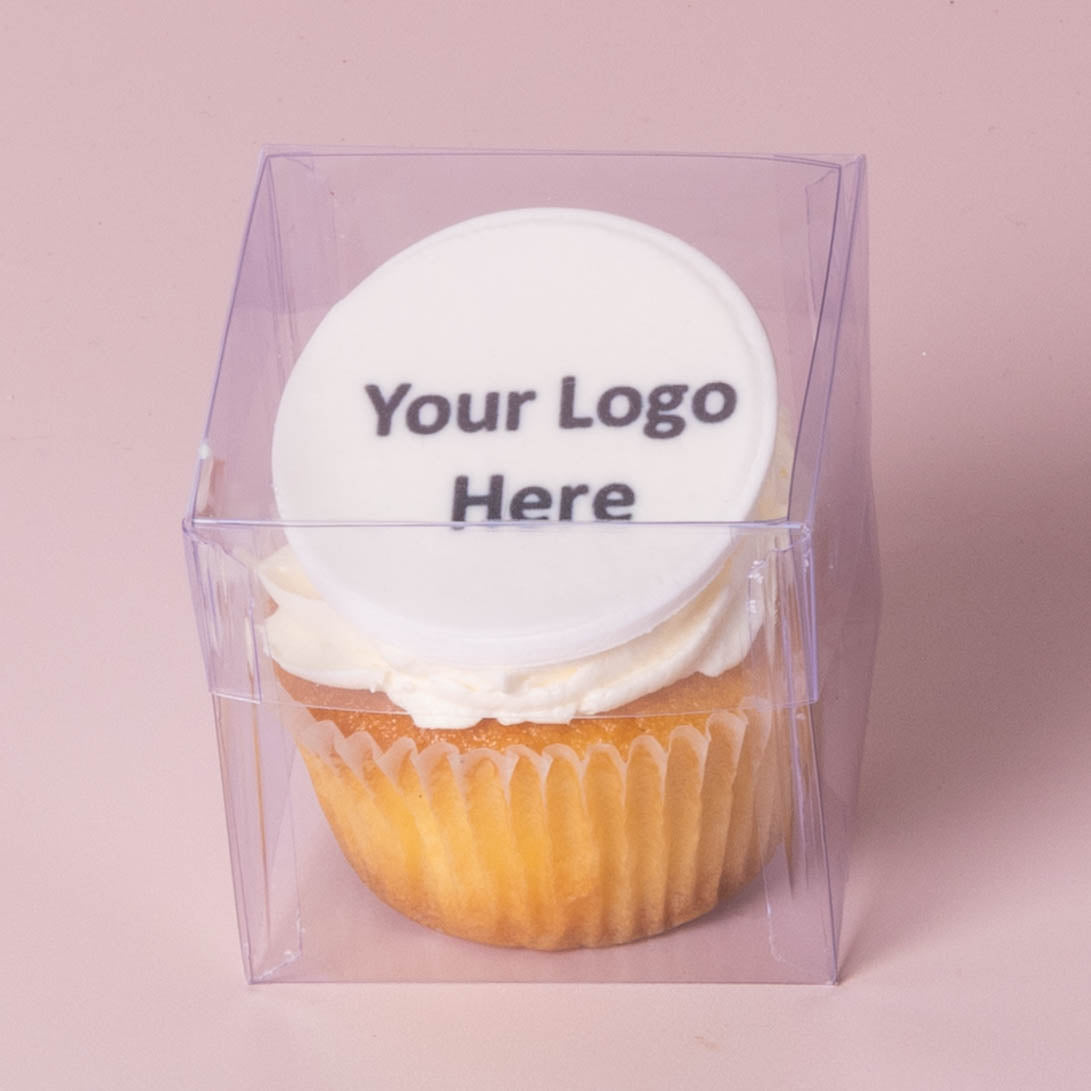 Each batch of logo cupcakes is baked fresh and finished with creamy buttercream under your custom edible logo plaque for a professional and delicious finish.