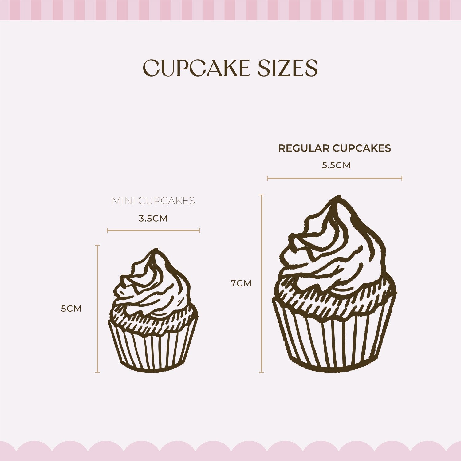• Mini cupcakes: 3.5 cm wide × 5 cm high
