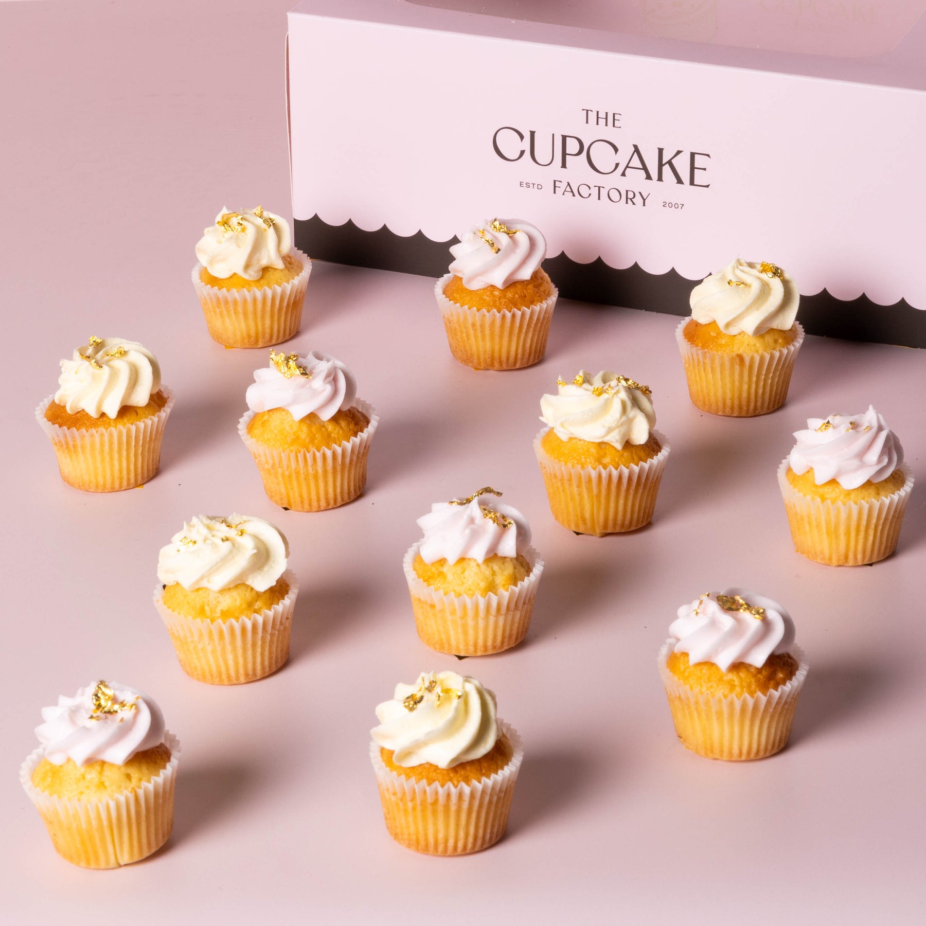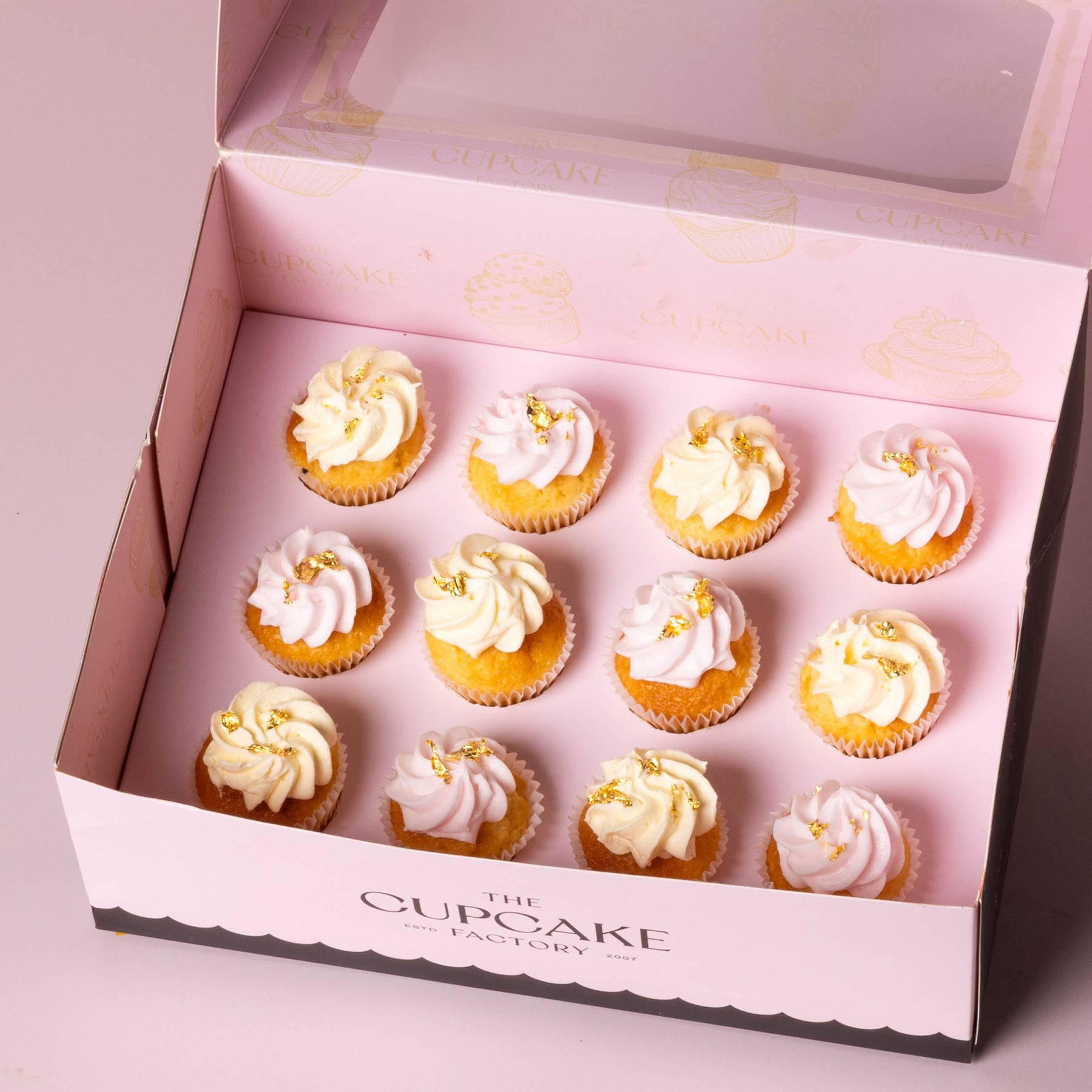 Timeless with a twist. These classic cupcakes are swirled with soft pink and white buttercream and finished with a touch of edible gold leaf for that extra hint of luxe. Perfect for parties, gifts, or a little everyday indulgence.