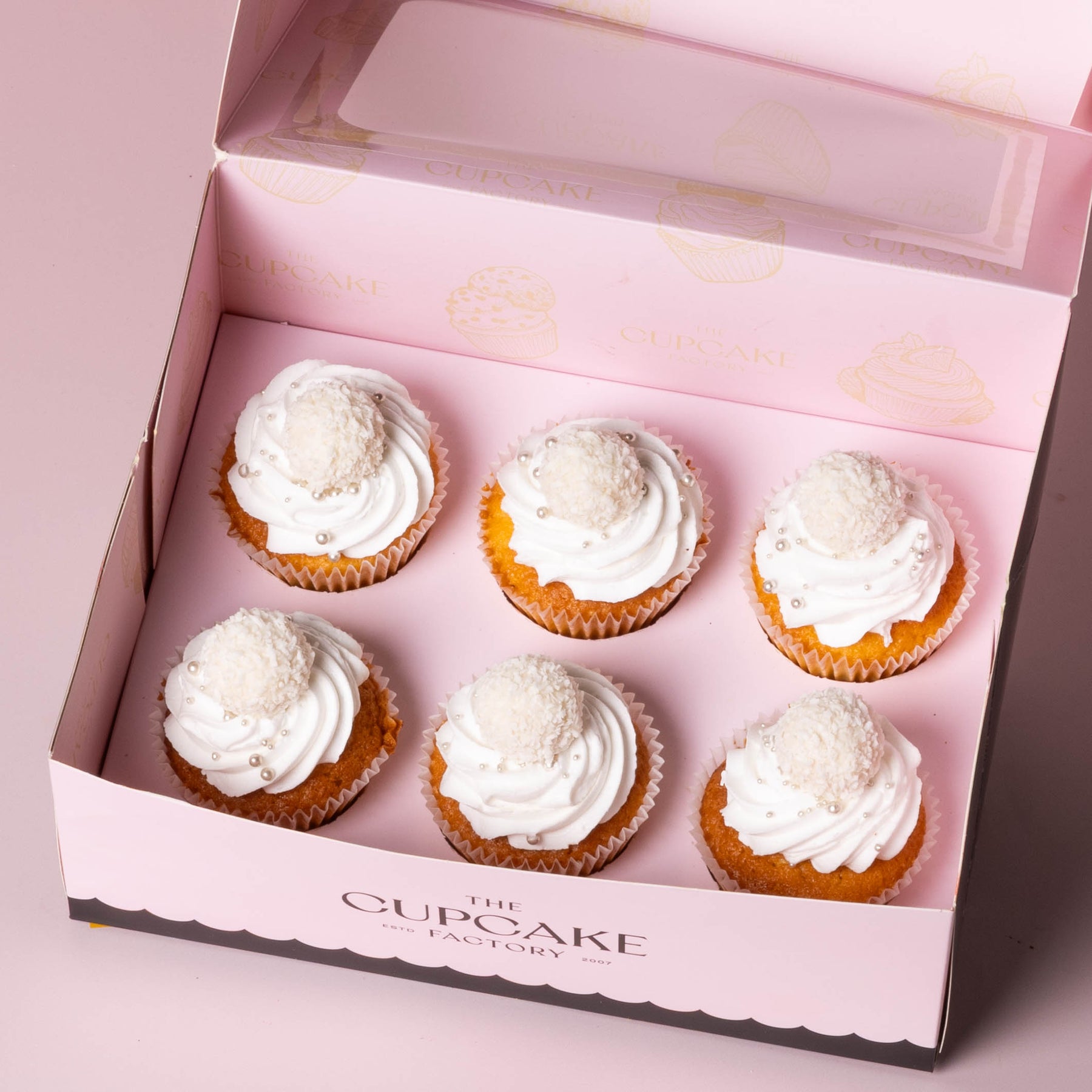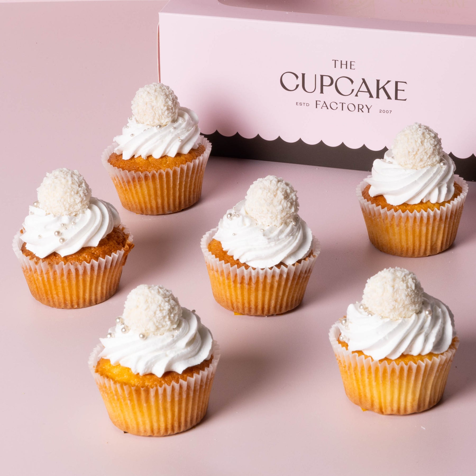 Pure indulgence in every bite. These cupcakes are crowned with a luscious Raffaello chocolate, featuring a creamy coconut center and a delicate almond crunch. Paired with a soft vanilla or rich chocolate base and smooth buttercream, this is a treat that’s as elegant as it is irresistible. Also available on chocolate cupcakes for the ultimate sweet escape!