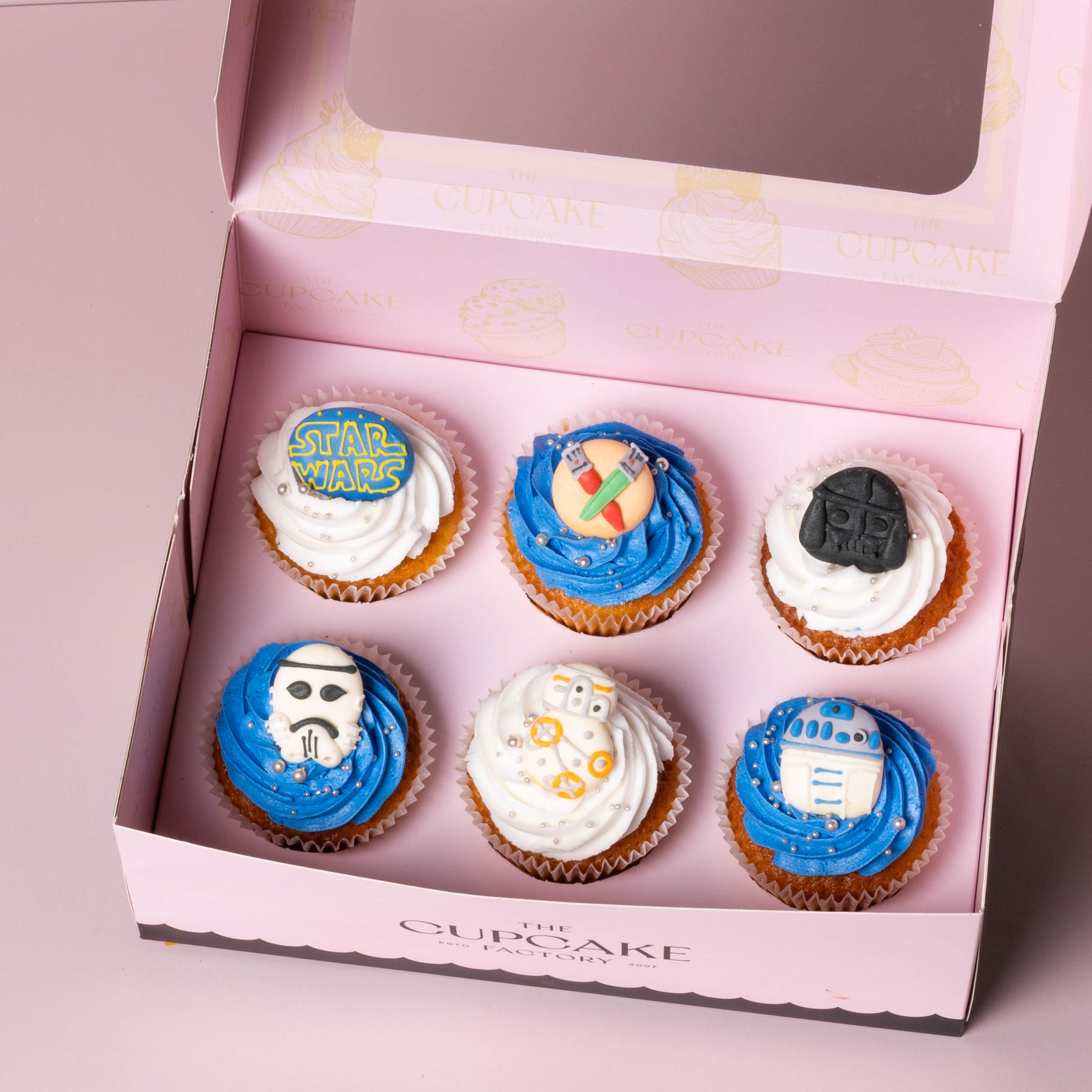 They’re regular-sized cupcakes topped with light buttercream and finished with Star Wars-themed decorations like lightsabers, Stormtroopers, or galactic symbols. Each one is styled to bring the iconic franchise to life, while still offering the delicious taste of freshly baked sponge.