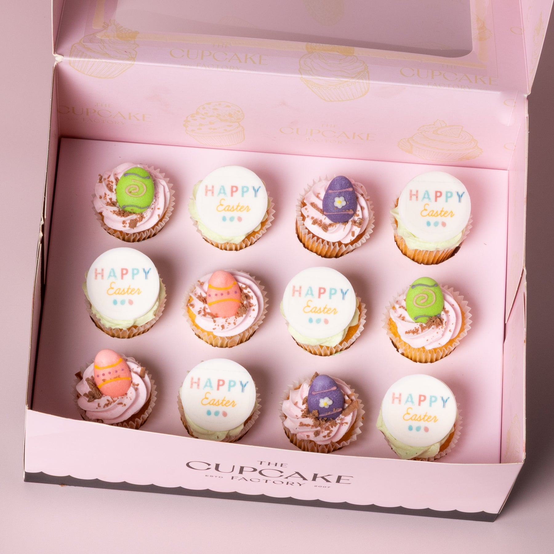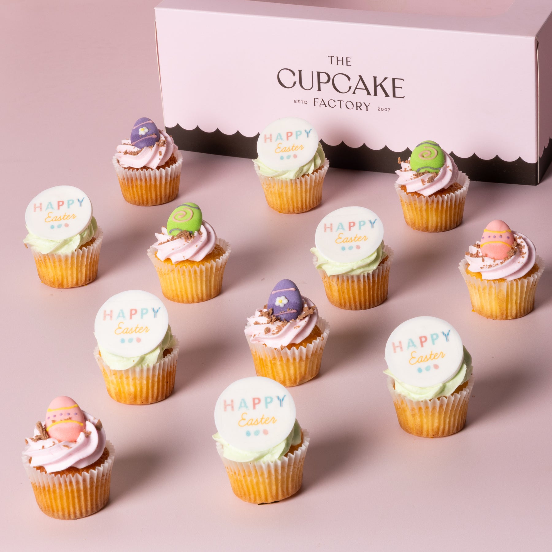 Our Easter-themed cupcakes are bursting with pastel perfection and playful charm. Each fluffy sponge is crowned with silky, pastel-coloured buttercream swirls and finished with the sweetest little touches, think mini eggs, Happy Easter plaques, and delicious flake crumbled that look almost too pretty to eat.