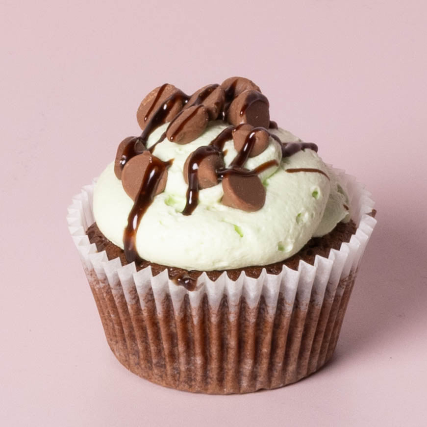 A cool, minty twist on pure chocolate bliss. Our rich, decadent chocolate cupcake is topped with velvety peppermint buttercream and studded with chocolate drops that bring just the right amount of crunch. It’s like a chocolate-mint party in your mouth, and you’re definitely invited.