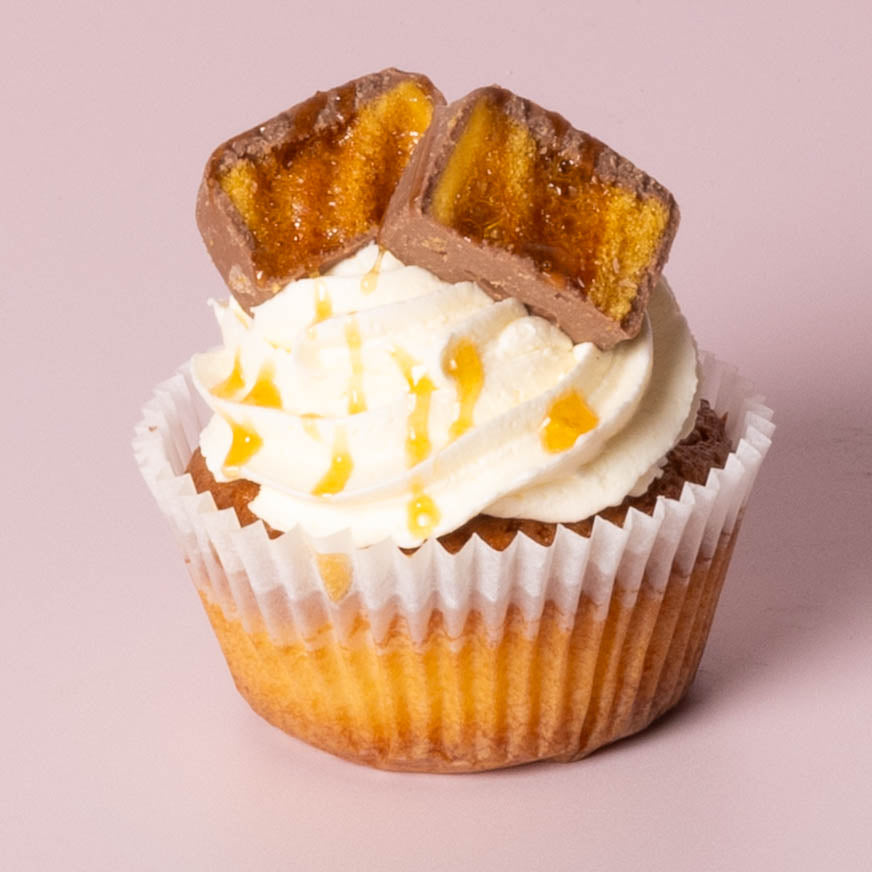 This one's for the ultimate sweet tooth. Choose between our fluffy vanilla or rich chocolate base, crowned with irresistible Crunchie pieces, a luscious drizzle of chocolate sauce, and a swirl of velvety buttercream. It’s the perfect balance of crunch, sweetness, and pure indulgence. Also available on our chocolate cupcakes for double the decadence!