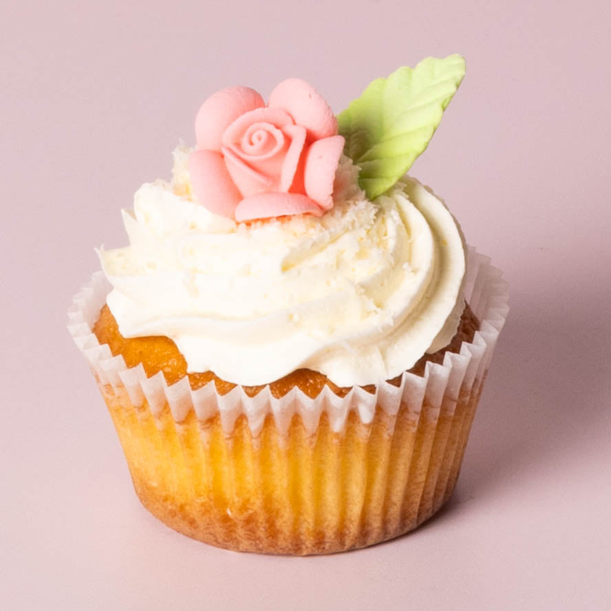 A burst of sunshine in every bite. Our fluffy vanilla cupcake is topped with zesty lemon icing, a sprinkle of coconut, and a swirl of smooth buttercream. Finished with a delicate rose flower, this cupcake is as refreshing as it is beautiful. Also available on chocolate cupcakes for an extra indulgent twist!