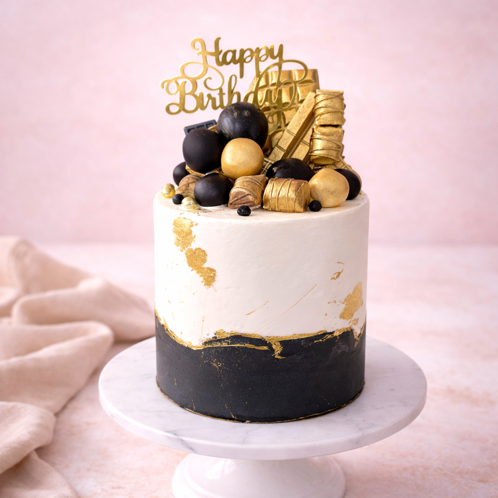 To maintain the freshness of the black and gold cake, it’s best stored in a cool, dry place. If refrigerating, remove it 1–2 hours before serving so the buttercream has time to soften back to its silky texture. This ensures the flavours are enjoyed at their best. Always keep the cake away from direct sunlight or heat sources, as metallic decorations and buttercream can be sensitive to temperature.