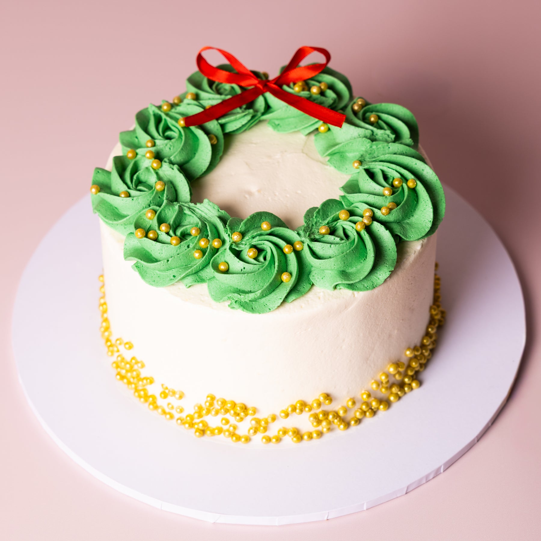 Each sponge is layered with buttercream to complement the festive wreath design.
